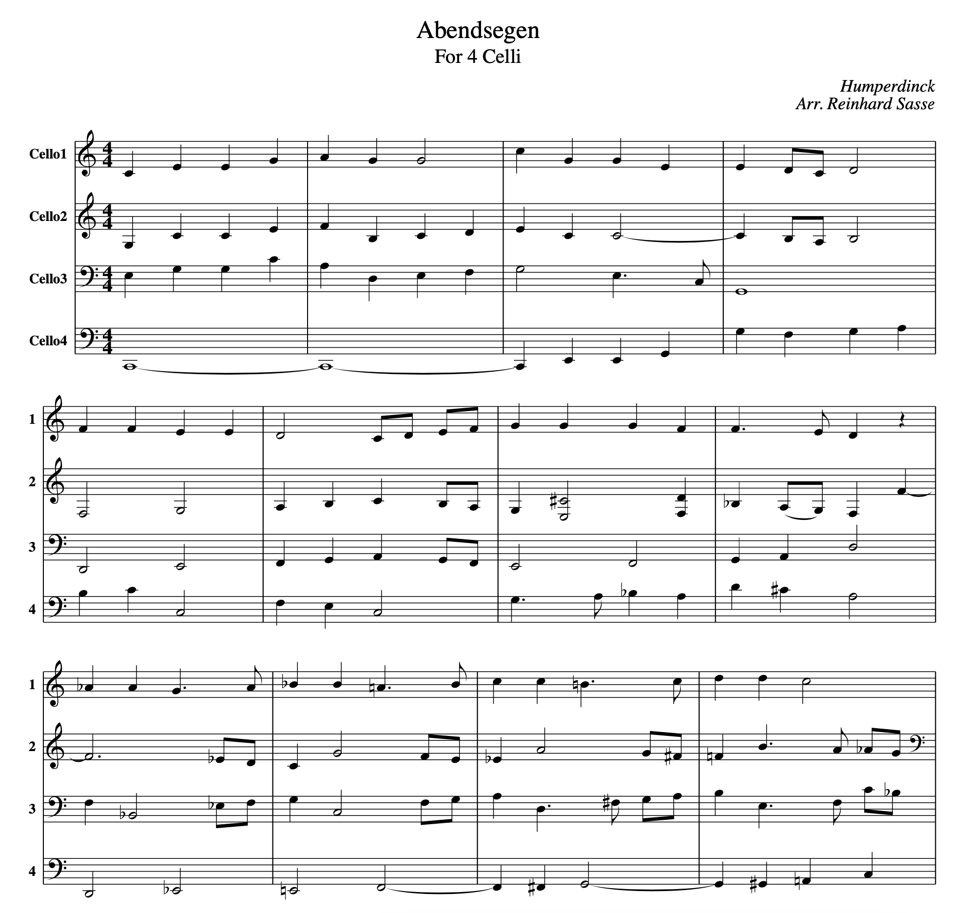 Arrangement des Abendsegens aus der Oper Hänsel und Gretel von Humperndinck für vier Celli.